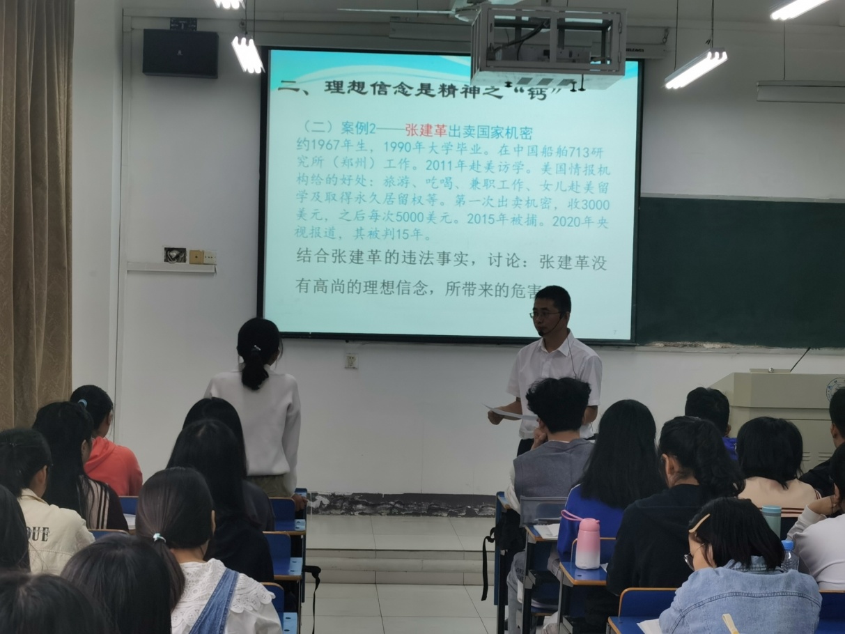 赵伟在香远楼425教室与外语A2113、A2114班同学一同聆听了余志权老师的《思想道德与法治》。余老师以正反两个案例导入,重点讲述了理想信念是精神之“钙”,引导同学们要坚定理想信念,做有担当、敢作为、有能力的新时代青年。课堂上同学们专心听讲,紧跟老师的教学思路,积极回答问题。