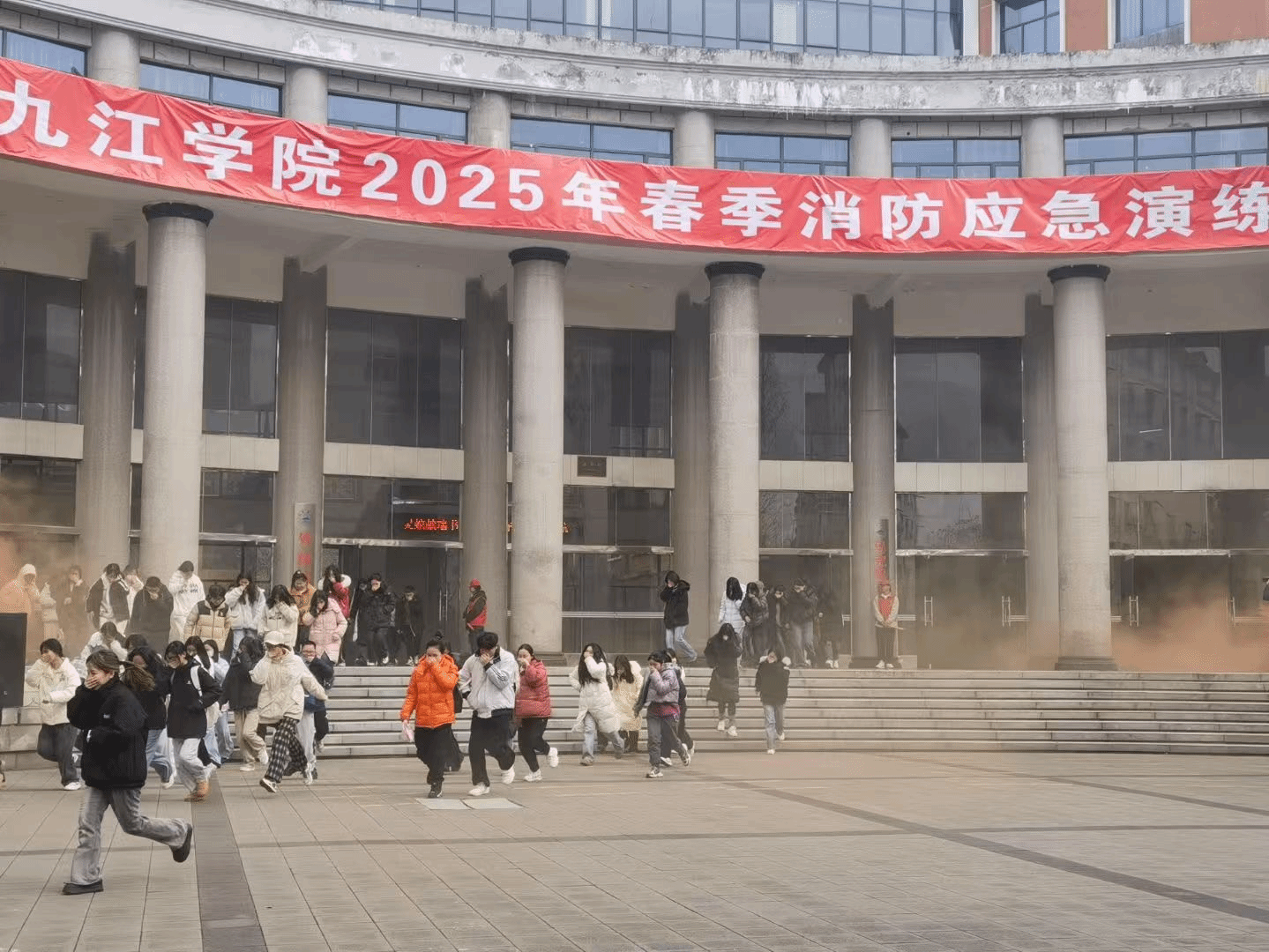 演练模拟火灾场景,香远楼滚滚浓烟迅速弥漫。师生迅速响应,依照预定的疏散方案,学生用湿毛巾捂住口鼻,压低身姿,沿着安全通道有序疏散。濂溪区消防救援大队火速调遣消防救援车赶到现场救援,火情得到有效控制。短短几分钟,全体人员安全集结,充分展现出师生们日常应急训练的扎实成果。