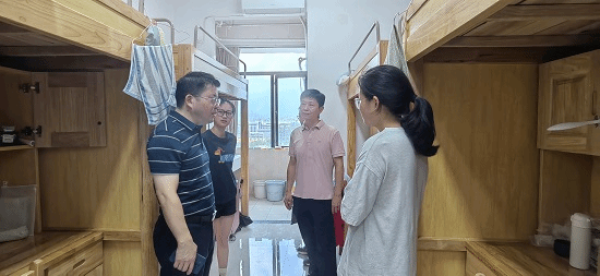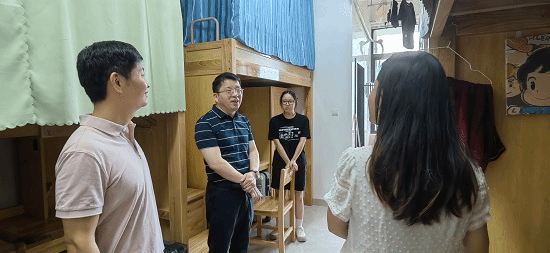 在宿舍里,院领导与同学们亲切交流,询问了同学们当前的学习生活状态以及考研规划,鼓励同学们踏实学习,希望同学们抓住暑期复习备考的关键时期,制定好科学合理的学习计划,锚定目标,认真学习,互帮互助。院领导还强调了学校、学院关于暑期留校的各项要求,并叮嘱同学们调整好心态,做到劳逸结合,注意防暑降温,做好应对台风“格美”入境江西引发的极端天气,不断提高安全防范意识,特别是宿舍用电和夏季消防安全,遇到问题及时向学院反馈。