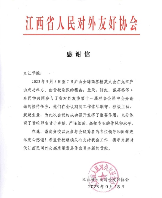 2023年9月5日至7日庐山全球商界精英大会在九江庐山成功举办,我院派外语专业学生志愿者积极参加活动并做好会议服务工作。