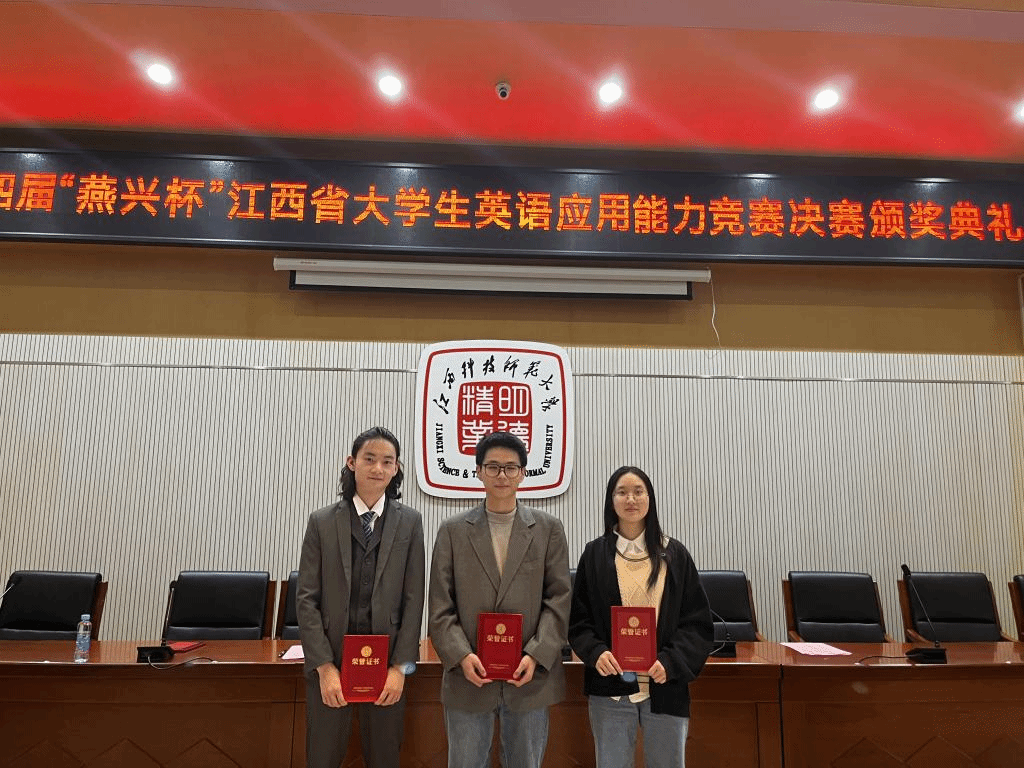 10月20日至22日,由江西省教育厅主办,江西科技师范大学和北京燕兴国际教育联合承办,江西省外语学会协办的第四届“燕兴杯”江西省大学生英语应用能力竞赛决赛在江西科技师范大学落下帷幕。经过激烈角逐,我校WilliamHill威廉希尔学生徐睿荣获二等奖,徐佩如、陈浩荣获三等奖。