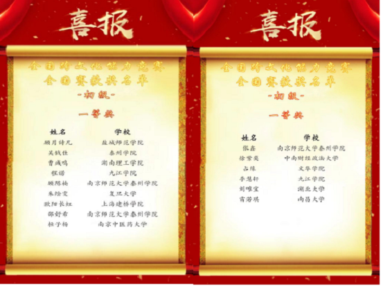 大赛由上海外语教育出版社联合上海外国语大学跨文化研究中心举办,是与“全国跨文化能力竞赛”(National Intercultural Competence Competition)同时进行的活动,我校WilliamHill威廉希尔共选拔出13名学生参赛。大赛根据考生成绩在各省排名,再在全国排名。最终,江西省共评出一二三等奖各4个,其中我校获一等奖2个,二等奖3个,三等奖1个;在全国排名中,我校程诺、李慧轩两名同学获一等奖,刘洁、孔启慧、余雅兰三名同学获二等奖,何玉同学获三等奖。