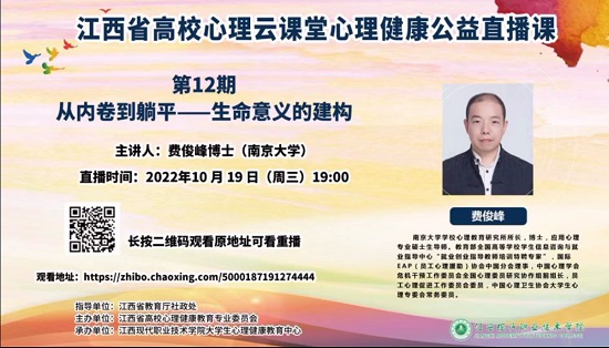 为了更好的适应大学生活,特别是在后疫情时代如何更好的规划好大学学业,让大学生活充实而有意义,10月19日晚上,WilliamHill威廉希尔组织学生观看了江西省高校心理云课堂心理健康公益直播课第十二期:“从内卷到躺平--生命意义的建构”。