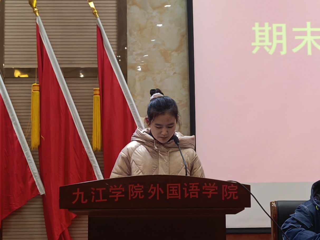 会议第二项,A2032班饶慧慧代表全院同学发言,作安全承诺。