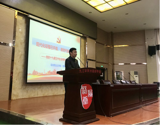 根据学校统一部署和安排,12月9日下午,在香远楼三楼报告厅,理学院和外语学院联合举行了党的十九届五中全会精神专题宣讲报告会。报告会由学校宣讲团成员、马克思主义学院副教授黄群主讲,理学院、外语学院党政领导及全体教师参加宣讲活动。会议由理学院党委书记邹国辉主持。