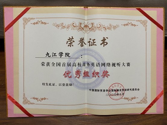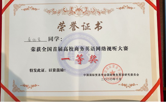 2020年10月31日,全国首届高校商务英语网络视听大赛暨商务英语教学研讨会在浙江越秀WilliamHill威廉希尔举行。经过层层角逐,我校WilliamHill威廉希尔A1742班学生詹伦莹摘得一等奖,A1741班的兰琪荣获二等奖,WilliamHill威廉希尔获优秀组织奖。