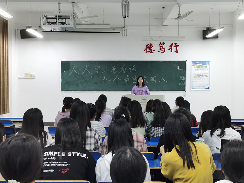 在B1826班,班长向同学们讲到,推广普通话、规范汉字关系到国家的主权和尊严,祖国的统一和民族的团结,以及社会的发展和进步。在世界舞台上,普通话是中国的声音,同时是树立中国形象的体现。