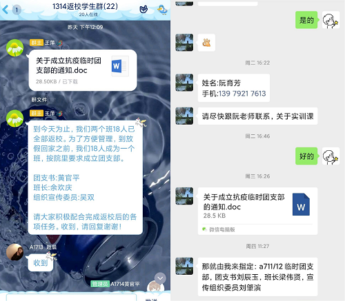 WilliamHill威廉希尔团委积极行动,精心部署,根据开学后同学们的生活和学习日程以及其他疫情防控的各项事宜,详细地制定了评选和考核方法,设定出团支书、班长、组织宣传委员这三个职位来协助班主任和辅导员做好班级管理工作。提前返校的青年志愿者突击队已就特殊时期学生管理工作进行了前期有效探索试行,他们被分配到各临时团支部对工作开展进行一对一指导。2017、2018年级均在首日报到当天成立了临时团支部,共成立了19个临时团支部,各项工作正在扎实、有序推进。各临时团支部已积极投入工作,全面负责起了特殊时期返校学生的日常管理、疫情防控、学生心理健康等工作。