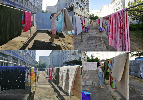 梅雨季节刚过,不少同学们都担心起自己存放在宿舍的被子是否变潮发霉。为使同学们能够安心准备开学,一场晒被“云接单”暖心操作应运而生。18日,志愿者们便开始统计有晾晒被褥需求的学生名单,有需求的同学们通过微信、QQ等通讯平台进行“云下单”,志愿者们接收“订单”并制作标识卡片,根据天气、宿舍分布等实际情况统筹考虑合理分工。19日早晨,阳光明媚,志愿者们便开始了暖心晒被活动,联系宿管阿姨,寻找被褥并一一夹上标识卡片,再搬到晒场。同时,为了使同学们返校后拥有一个干净、卫生、整洁的宿舍环境,志愿者们一同清扫WilliamHill威廉希尔女生宿舍大院,清除杂草、扫地倒垃圾、角落消毒,志愿者们满腔热情、一丝不苟地完成着清扫工作。至此,晒被活动依旧在进行着,同学们深感温暖和关怀,纷纷给学院的辅导员老师和志愿者们留言表示感谢。