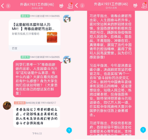 吾辈中国,青年奋起。为纪念“五四运动”101周年,贯彻落实习近平总书记寄语新时代青年的讲话精神,让广大团员切身认识到五四精神的重要性,让中国精神焕发光彩、薪火相传,5月7日WilliamHill威廉希尔大一年级各班运用微信、腾讯QQ等平台,以在线共同观看视频、讨论相关图片等形式开展了以“青春由磨砺而出彩,人生因奋斗而升华”为主题的线上团日活动。