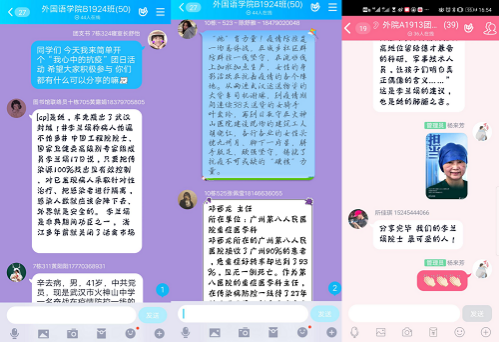 疫情防控思政大课后,团日活动正式开始,各班团支部书记给全体团员讲述了近期疫情的发展和影响,同学们也积极发言,感触颇深。A1933班的同学们以开放的形式,在班级QQ群里畅所欲言,团支部书记带领大家学习抗疫英雄事迹,认识身边最美逆行者。全国各地的无数医生护士主动放弃休假、放弃与家人团圆的机会,请缨前往一线支援武汉,他们为了千千万万家庭的安康,为了确保病患及时的收治,逆流而上,不是朝着家的灯光,而是背对着家的方向;不是前往年味十足的年夜饭,而是奔向急救室的病榻。一封封按满红手印的请缨书,一句句铿锵有力的话语,表明他们一致的信念——不计报酬,不论生死。在肆虐的疫情面前,这些冲锋在最前线的白衣战士是真正的英雄,他们的事迹令人感动。