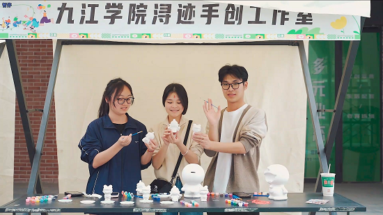 石膏娃娃彩绘区化身亲子乐园,庐山云雾、锁江楼等本地景观被设计成石膏底胚,孩子们执笔描绘心中的九江色彩。现场还发起“最美石膏娃娃”线上投票,吸引游客扫码参与,为古街文旅增添数字化互动体验。