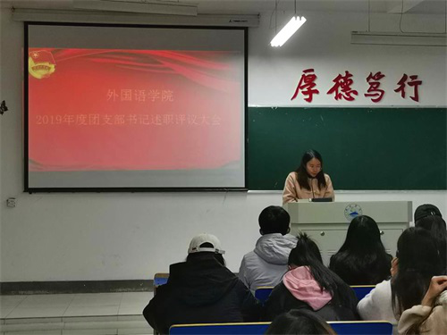 各班团支部书记围绕团支部基本情况、组织建设、政治理论学习、支部特色活动等方面对2019年工作进行述职报告。随后,与会人员对各团支书进行了评议。
