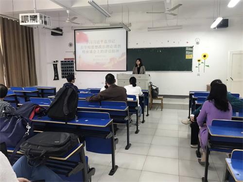 会上, 党支部书记赵宋文带领支部成员深入学习了习近平总书记在学校思想政治理论课教师座谈会上的重要讲话精神。她指出,习近平总书记在学校思想政治理论课教师座谈会上的重要讲话,从党和国家事业发展全局出发,强调了党的领导对做好教育工作、思想政治工作的重要性,明确了高校思想政治理论课教师用习近平新时代中国特色社会主义思想铸魂育人、立德树人的新使命,确立了高校思想政治理论课的新要求,为新时代全面贯彻党的教育方针、办好思想政治理论课作出了重要部署、明确了工作任务。我们作为英语教师,首先,应当在课程中渗透进思想政治教育,践行课程思政的改革,帮助大学生树立正确的人生观、价值观、世界观。同时,也应严格自律,为人师表,开阔视野,紧跟时代,自觉做好学生的表率。